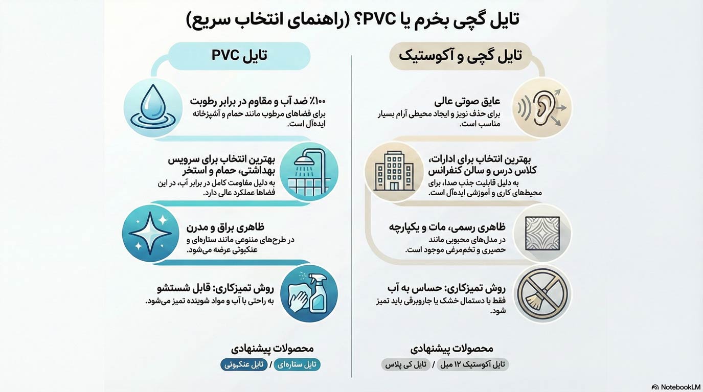 مزیت کلیدی: تایلهای PVC علاوه بر ضد آب بودن، بسیار سبک هستند و در صورت کثیف شدن به راحتی با یک دستمال مرطوب تمیز میشوند.
