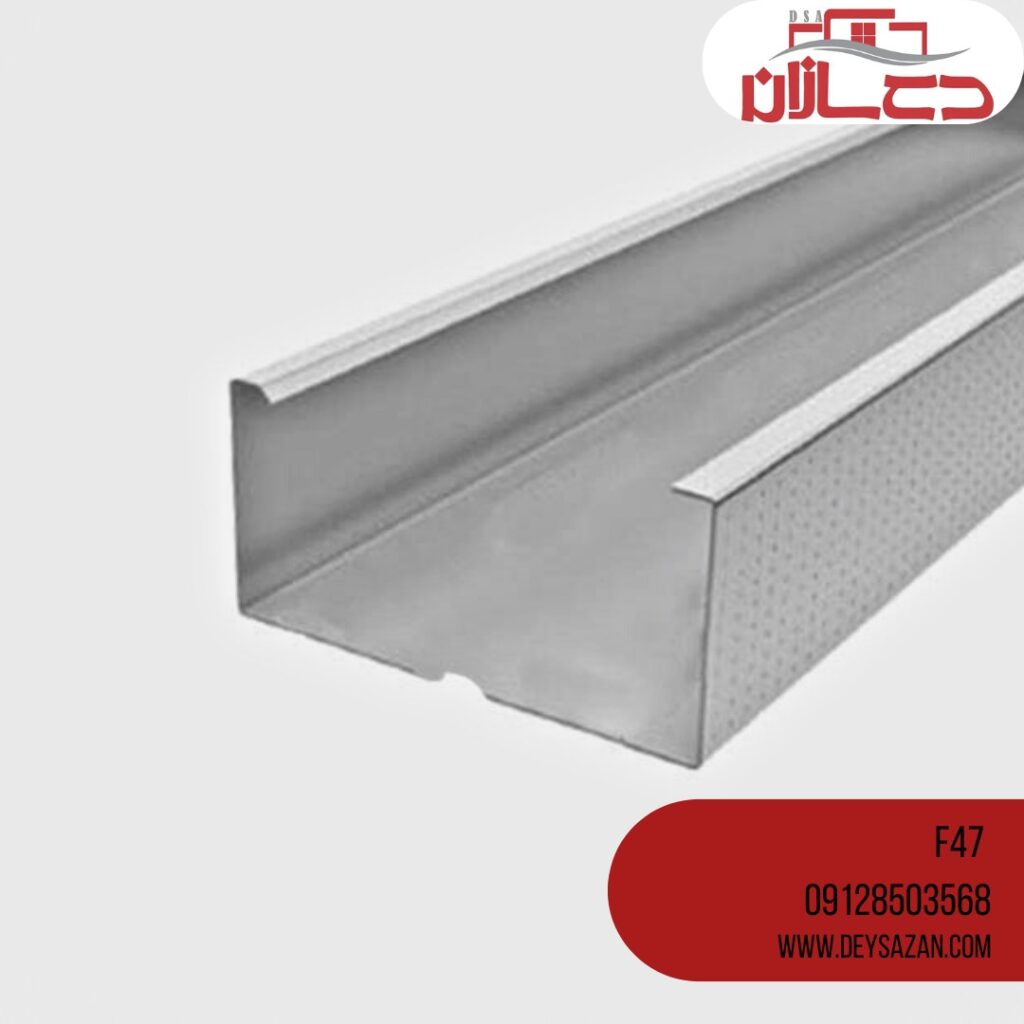پاسخ: پروفیل F47 یک مقطع فولادی گالوانیزه است که با روش نورد سرد تولید میشود و در زیرسازی سقف کاذب و دیوارهای خشک (کناف) استفاده میشود. شکل ظاهری آن C انگلیسی است و به دلیل پوشش گالوانیزه، در برابر رطوبت و خوردگی مقاومت مناسبی دارد.