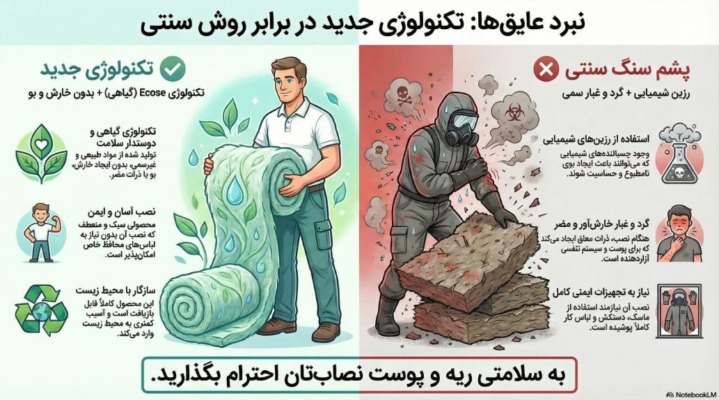 شاید بپرسید: «چرا نباید پشم سنگ فلهای ارزان بخرم؟»پاسخ در تکنولوژی ساخت نهفته است. عایقهای (پشم معدنی Mineral Plus) با تکنولوژی نانو و بایندرهای گیاهی تولید میشوند که ۴ تفاوت بزرگ با عایقهای قدیمی ایجاد میکند: