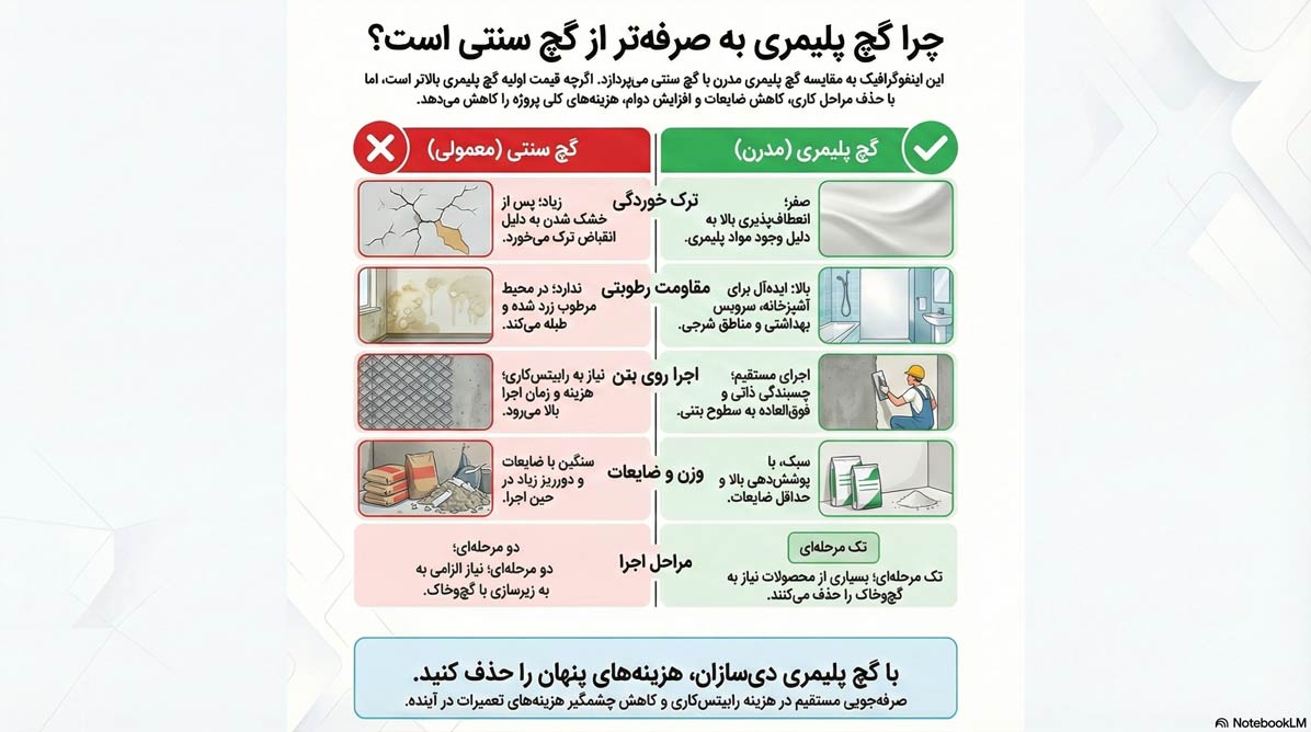 حذف مرحله گچ و خاک: بسیاری از گچ‌های پلیمری (مثل MP Max) تک‌مرحله‌ای هستند و سرعت اجرای پروژه را تا ۲ برابر افزایش می‌دهند.