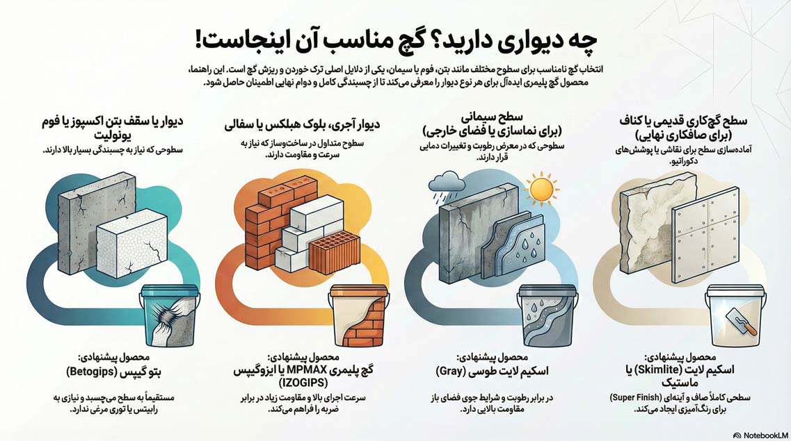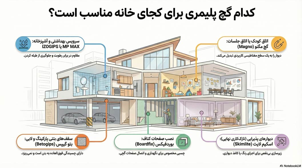 تنوع محصولات پلیمری ممکن است گیج‌کننده باشد. اشتباه در انتخاب نوع گچ، نه تنها هزینه شما را هدر می‌دهد، بلکه ممکن است منجر به ترک خوردن دیوار یا ریزش گچ شود. برای انتخاب درست، به دو فاکتور “محیط پروژه” و “بودجه” توجه کنید: