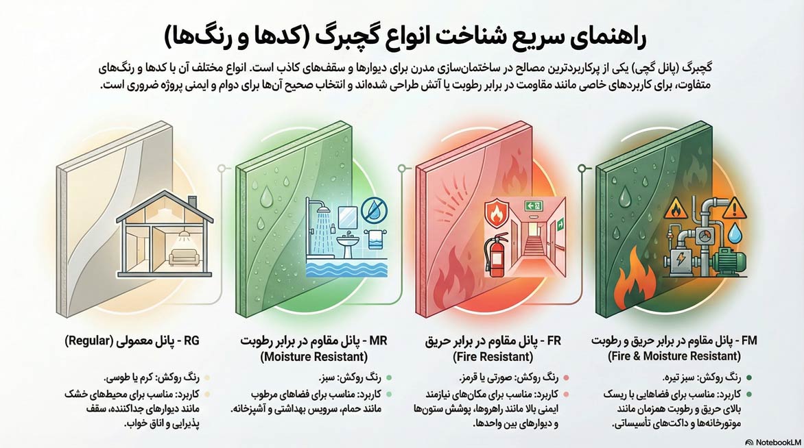 2. گچبرگ ضد حریق و رطوبت (FM): کاملترین نوع پانل که همزمان خواص ضد آب و ضد آتش را دارد (معمولاً با روکش سبز تیره یا مشخصات خاص).