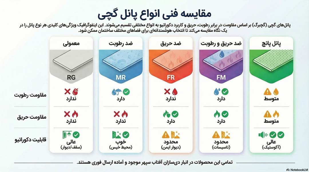 انتخاب صحیح نوع پانل گچی، مهمترین گام در اجرای سیستمهای ساخت و ساز خشک (Drywall) است. در دیسازان آفتاب سپهر، محصولات بر اساس مقاومت در برابر رطوبت، آتشسوزی و کاربردهای دکوراتیو دستهبندی میشوند. پیش از خرید، باید مشخص کنید که این پانلها قرار است در کدام بخش از ساختمان (سقف کاذب، دیوار جداکننده یا محیط مرطوب) نصب شوند.
