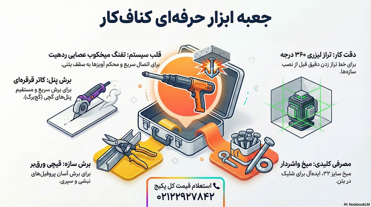 یک نصاب حرفهای سقف کاذب میداند که تفنگ میخکوب به تنهایی کافی نیست. برای اینکه سرعت و دقت اجرای شما با استانداردهای روز مطابقت داشته باشد، پیشنهاد میکنیم نگاهی به ابزارهای زیر که مکمل کار با میخکوب ردهیت هستند، بیندازید: