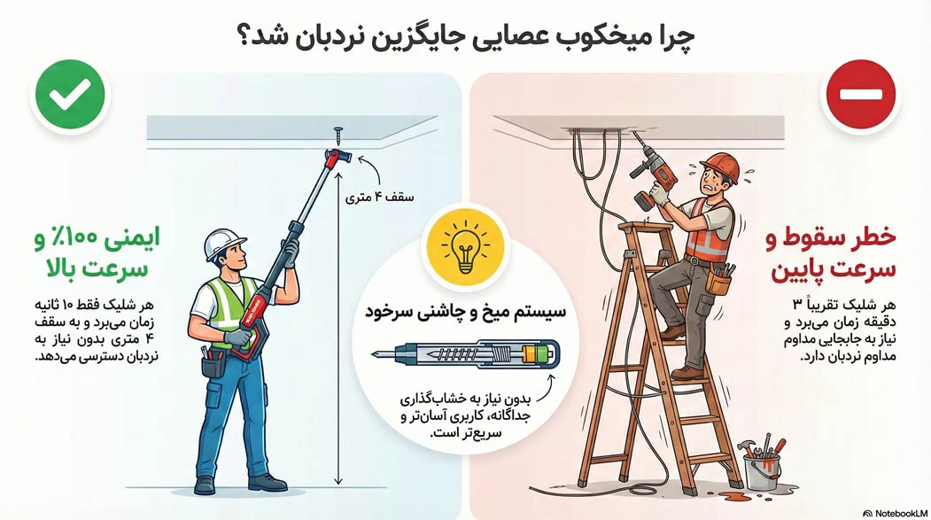 آیا هنوز برای شلیک میخ به سقف از نردبان، بشکه یا داربست استفاده میکنید؟ سقوط از ارتفاع، بزرگترین خطری است که همواره کنافکارها و راویزکارها را تهدید میکند. اما تکنولوژی جدید راه حلی ایمن، سریع و بیصدا پیش پای شما گذاشته است.