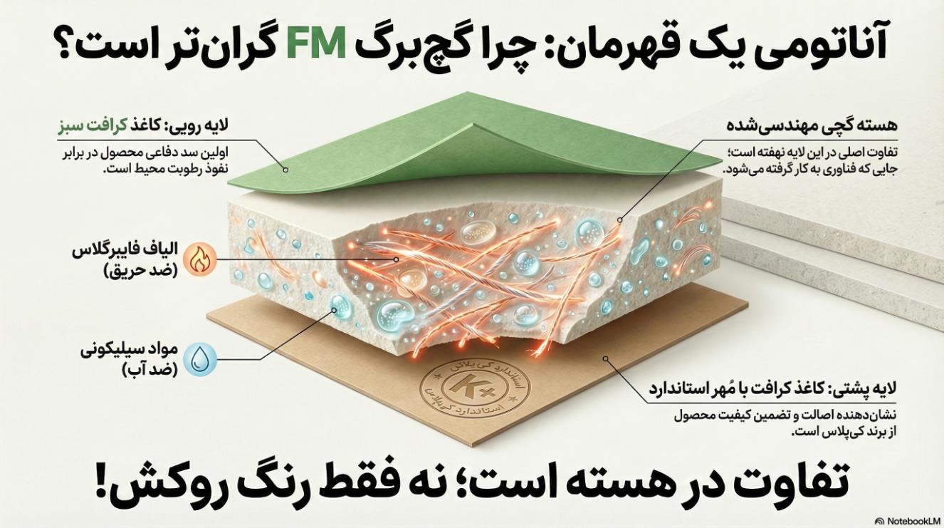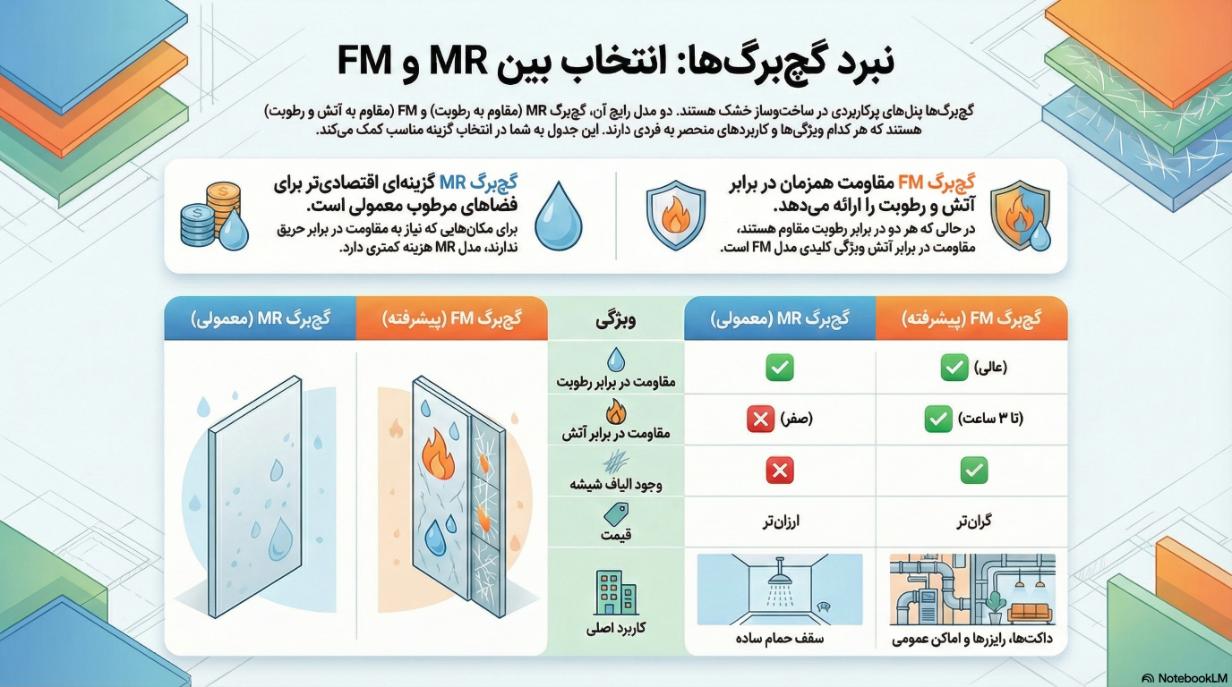 پیشنهاد مشاور: اگر پروژه شما یک بازسازی مسکونی معمولی (مثل سقف حمام) است، میتوانید برای صرفهجویی در هزینه از (گچ برگ ضد رطوبت MR) استفاده کنید که قیمت مناسبتری دارد. اما برای رایزرها و مشاعات، ریسک نکنید و حتماً FM بخرید.